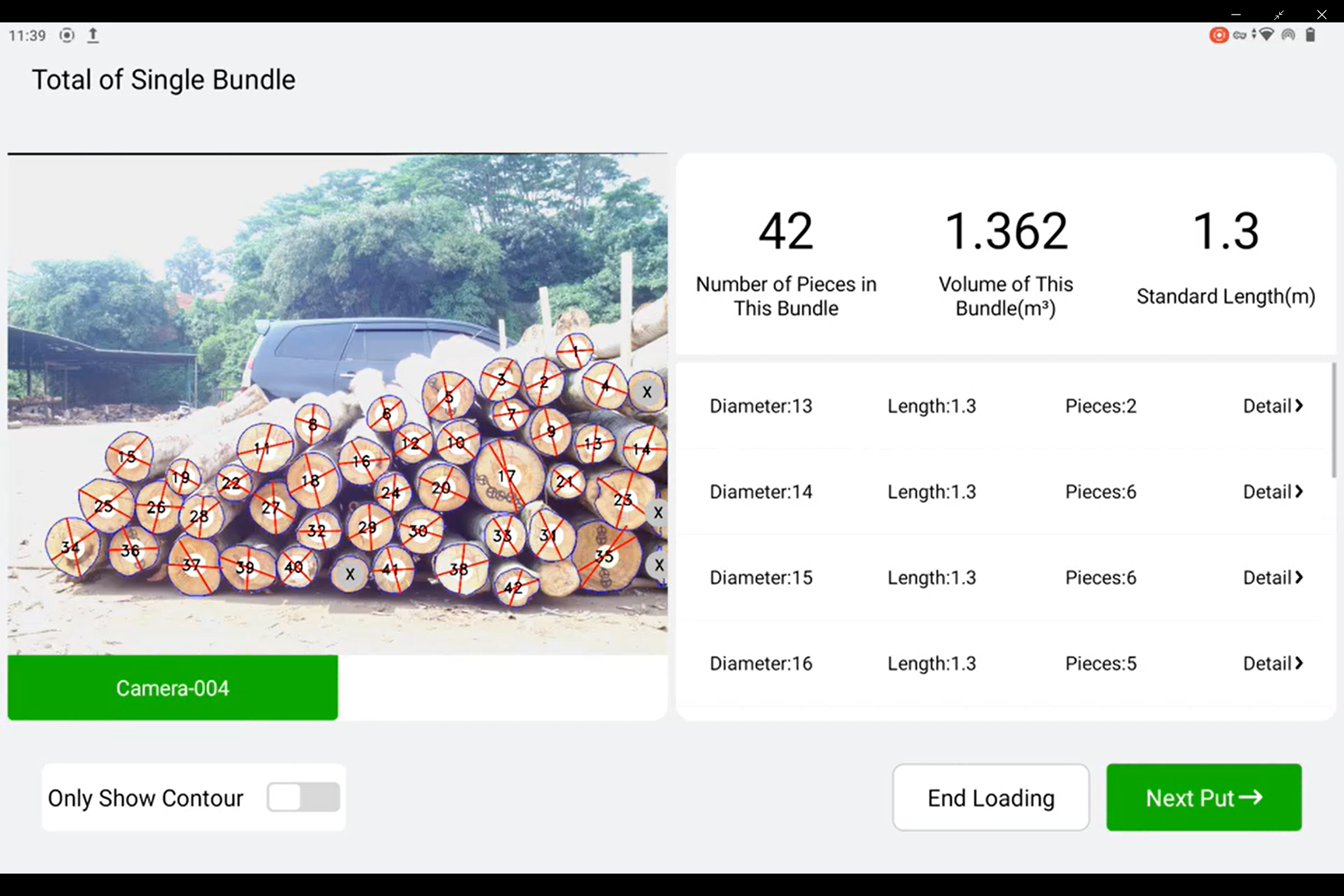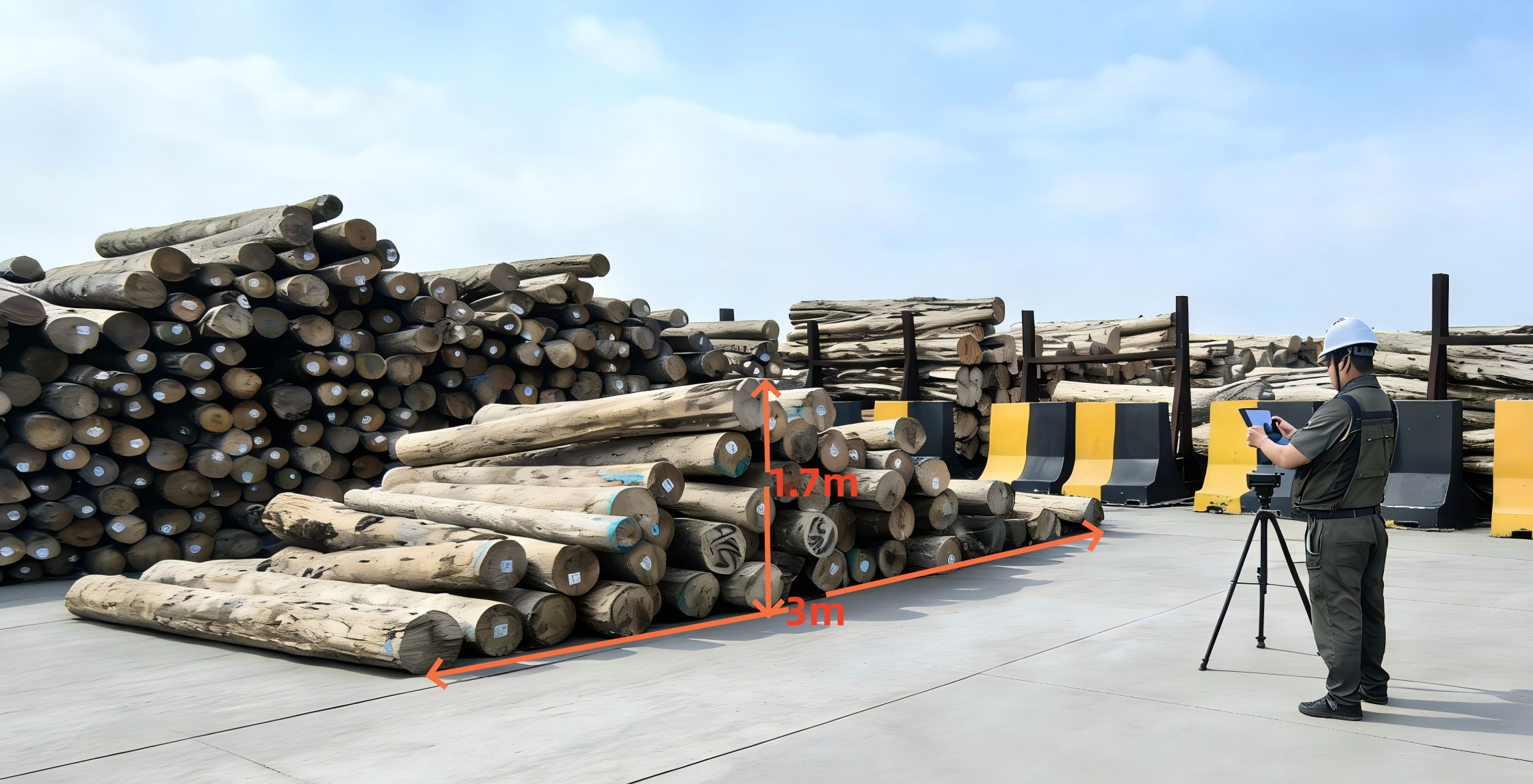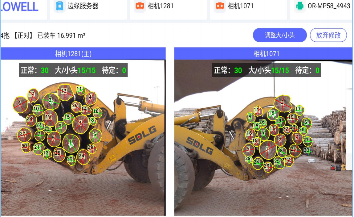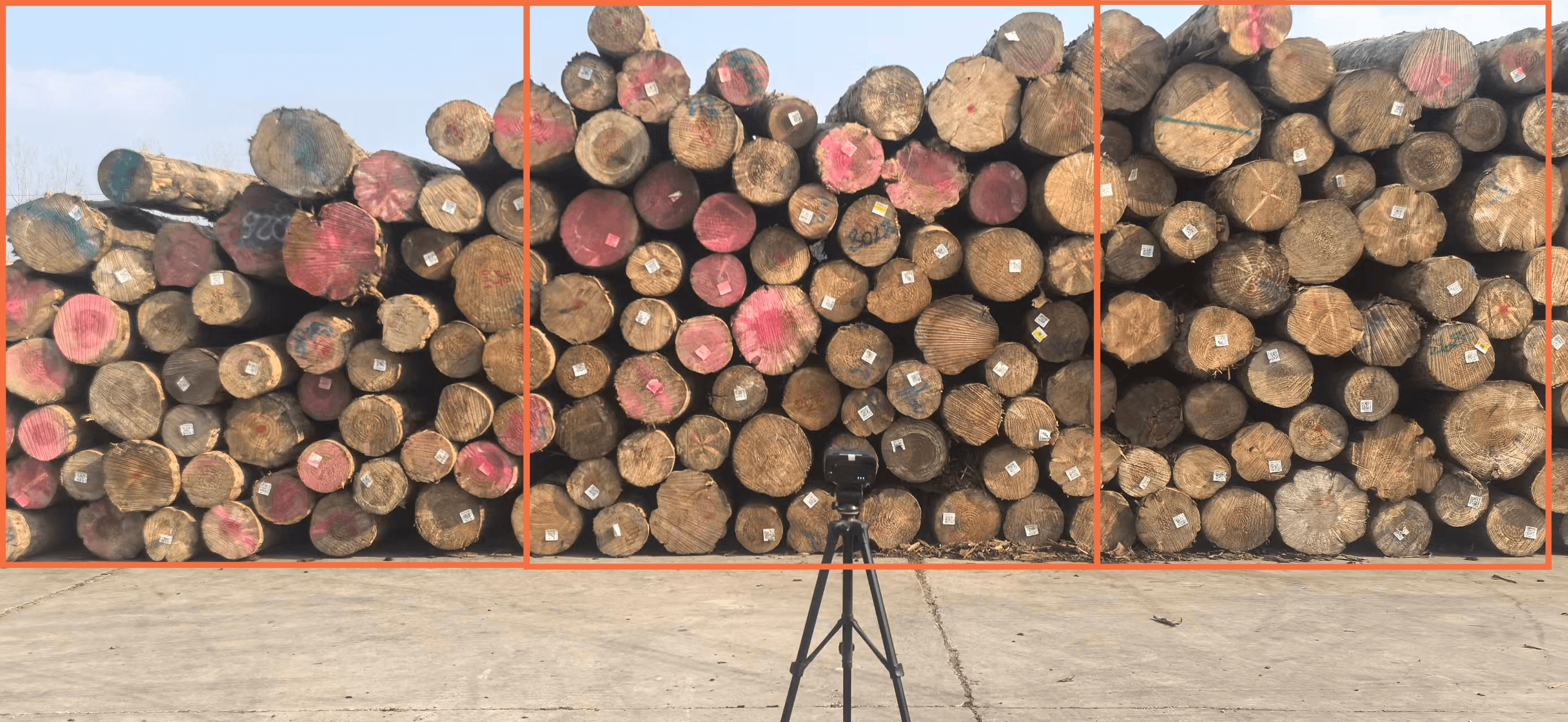 A: 2 End matching mode ( 2 camare take 2 photos, the AI will identify the larg log end and small log end it self, then calcaulte log measurement volume according small log end. * need 2 camera +1 pad * Accuracy 99.5% * when logs on Grabber | B : 1 photo mode * the logs already been arranged according the large end /small end * the log stack max 3x1.7m * need 1 camera. * Accuracy 99.5% | C : Multi photos mode * Suit for large log stacke *need take several photos * need operator identify the duplicate logs from two photos then remove it |